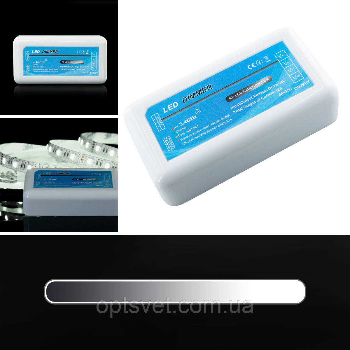 Димер OEMD-12A-2.4G-3zone використовуватиметься для керування яскравістю світлодіодних стрічок. Електрична потужність виробу становить 144 Вт, сила струму на виході — 12 А (по 4 А на кожен з трьох каналів). Робоча напруга моделі — 12-24 В постійного струму.